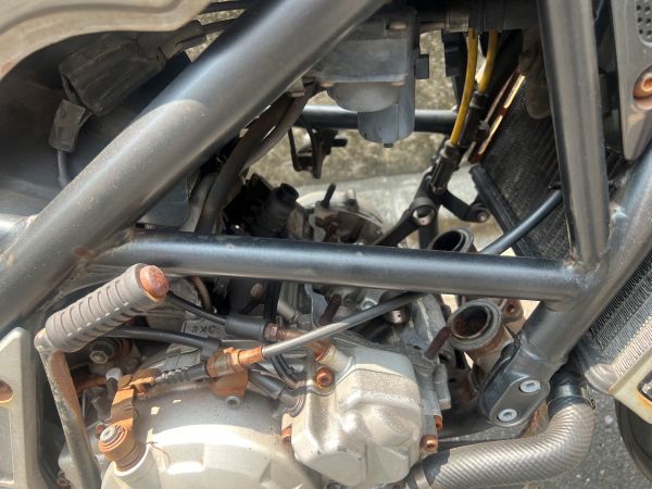 シリンダーから上がないエンジン。クランクも死んでるかと思いましたが、無理なく回ります。まあこの部分は使わないのでいいのですけど。キャプレター(スロットル)も固着してませんでした。ブレーキは完全に固着してレバーはびくともしません。まあそんなのはこれまでいくつも相手にしてきたので、楽しく作業いたします。